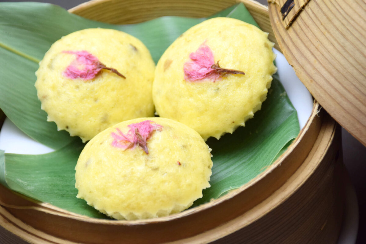 塩漬け桜の花を練り込んだ生地をふんわり蒸し上げた、桜香るマーラーカオ。
