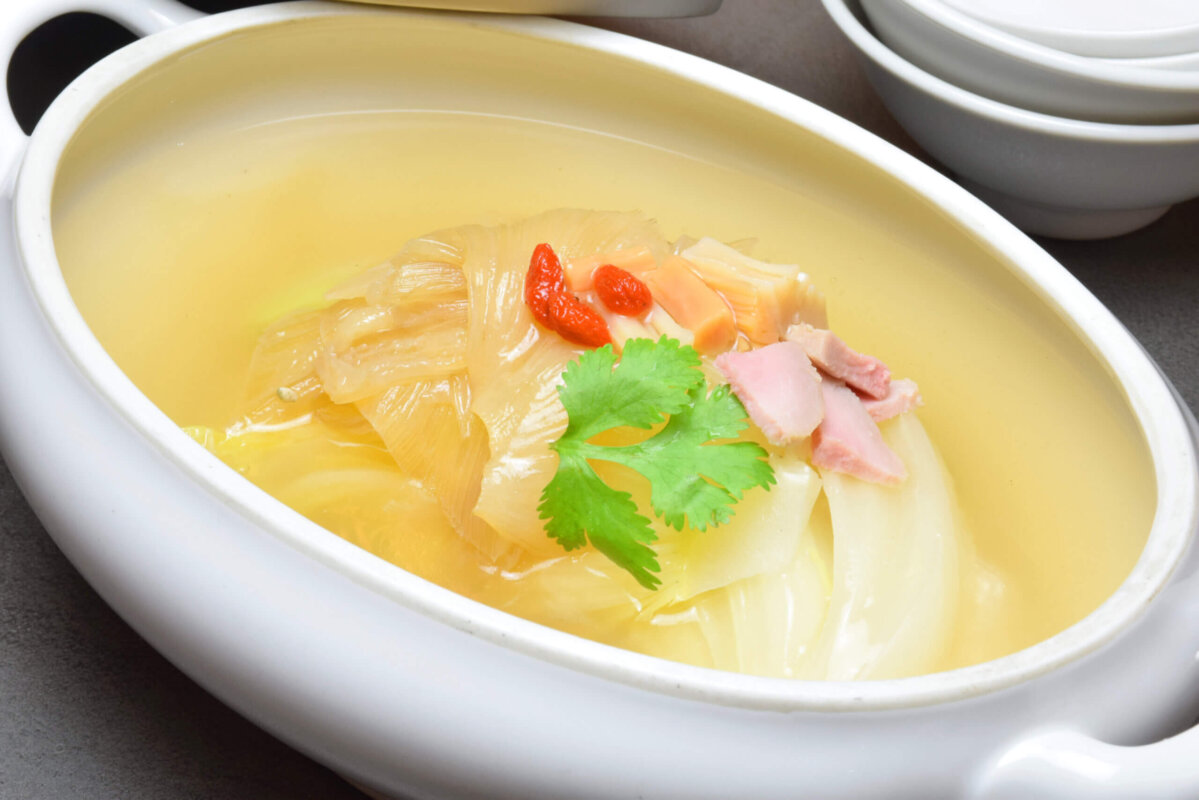 フカヒレと金華ハム干し貝柱の旨味蒸しスープ コラーゲンたっぷりの鶏ガラスープで金華ハムと干し貝柱の旨みをじっくり引き出し フカヒレを合わせた蒸しスープ。深い香り旨味、やさしい口当たりが広がります。 2,530円