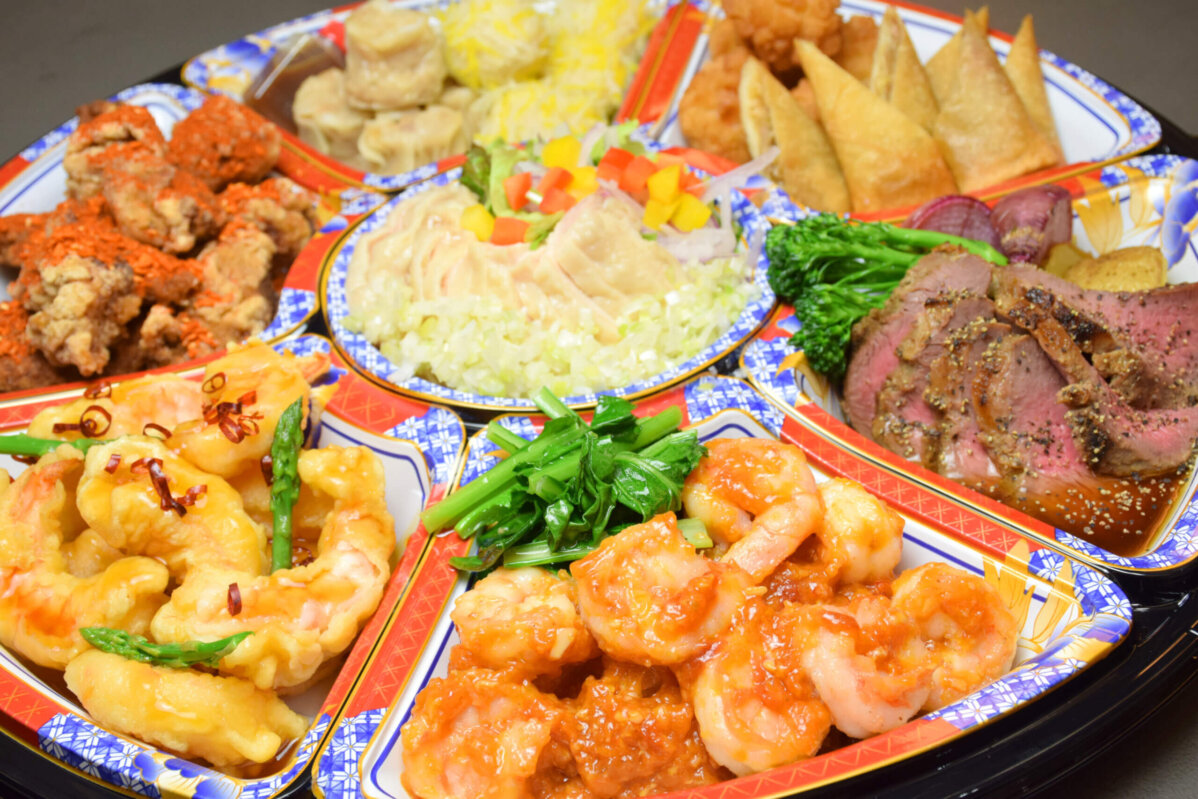 お料理盛り合わせ(13,000円) 人気中華料理の盛り合わせ(5~6名様) ・エビのチリソース ・エビの甘だき ・毛沢東スペアリブ (酢豚に変更も可) ・牛リブロースのグリル 黒胡椒ソース ・若鶏の蒸し物 香味ネギソース ・揚げ物2種 (エビ団子の鹿の子揚げ&サクサク春巻き) ・焼売2種盛り合わせ (肉焼売&もち米焼売) 13,000 (税込 14,040)円